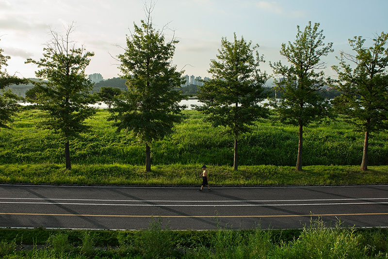 한강을 둘러싼 공간은 단순하고 견고한 질서로 이루어져 있다. 강물에서 시작해 콘크리트 호안, 자전거도로와 산책로, 공원, 자동차 도로, 그리고 주거지로 이어지는 구조다. 이는 도시가 자연을 어떻게 정리하고 배치했는지를 명확히 보여준다. 강을 중심으로 양쪽이 대칭을 이루는 이 풍경 속에서 모든 것은 수평으로 흐른다. 사람들은 강 앞에서 더 이상 나아가지 못하고 가로로 이동하며, 강을 건너기 위해서는 반드시 다리를 이용해야만 한다.