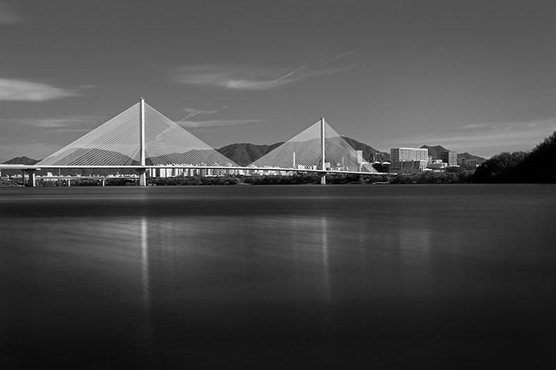이 시리즈에 담긴 사진은 2017년부터 완공 이후까지 이어지고 있다. 1,000장이 넘게 축적해 온 방대한 아카이브는 자연과 건축물이 어떻게 조화를 이루는지 보여준다. 세계 최장 길이의 콘크리트 사장교라는 기술적 성취를 넘어, 물길을 건너기 위해 배다리를 설치했던 옛사람의 마음과 지금의 현실이 교차하는 의미가 담겨 있다. 수백 년이 지나 540미터의 상판을 허공에 띄워 낸 현대 기술이 교감하는 이 공간에서 한강의 또 다른 역사가 시작되었고, 역사는 조용히 흘러가고 있다.