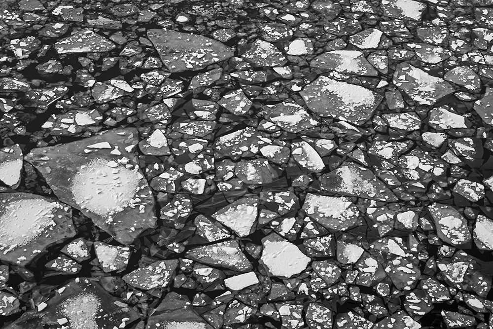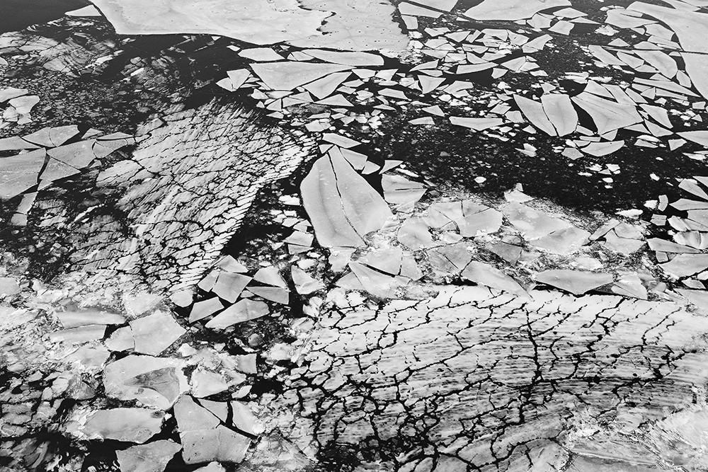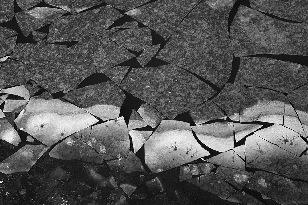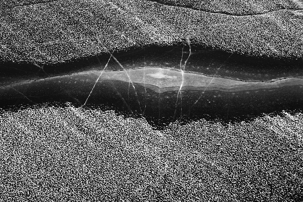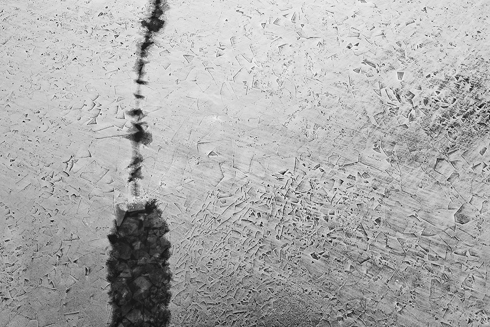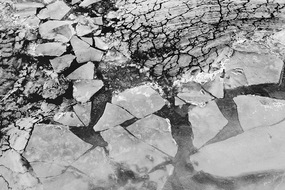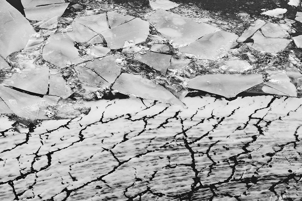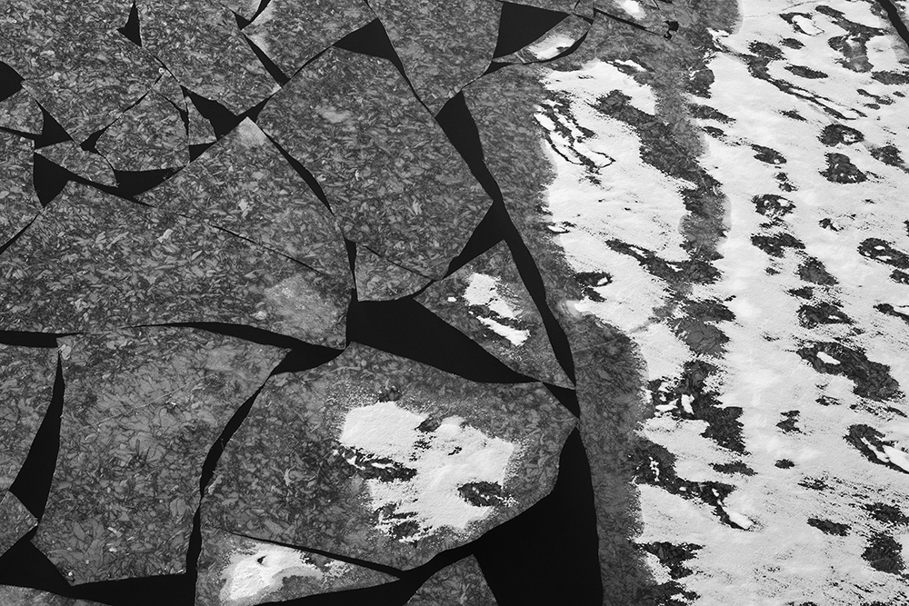 사진 속 하얗고 검은 기하학적 패턴들은 모두 얼어붙은 한강의 단면이다. 다리 위에서 수면을 부감(俯瞰)으로 촬영해, 강이 스스로 만들어낸 거대한 추상화를 프레임 안에 담았다. 눈이 쌓인 곳은 순백으로, 눈이 녹거나 거친 얼음이 드러난 곳은 짙은 검은색으로 나타난다. 늘 흐르던 강물이 유려한 선을 보여준다면, 깊은 겨울 결빙된 강물은 단단하고 정적인 면과 패턴을 드러낸다.