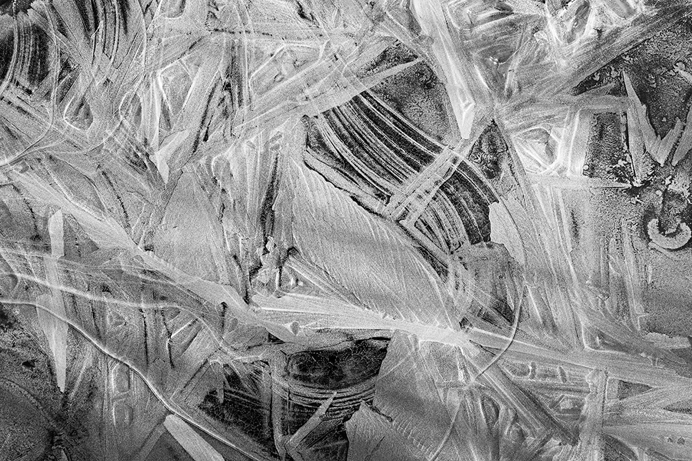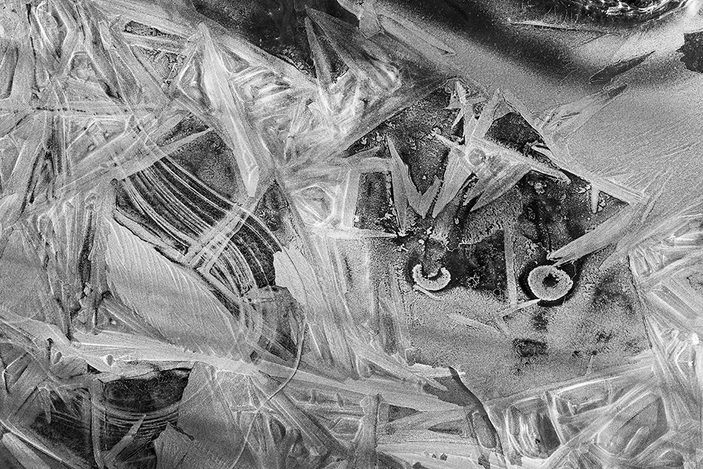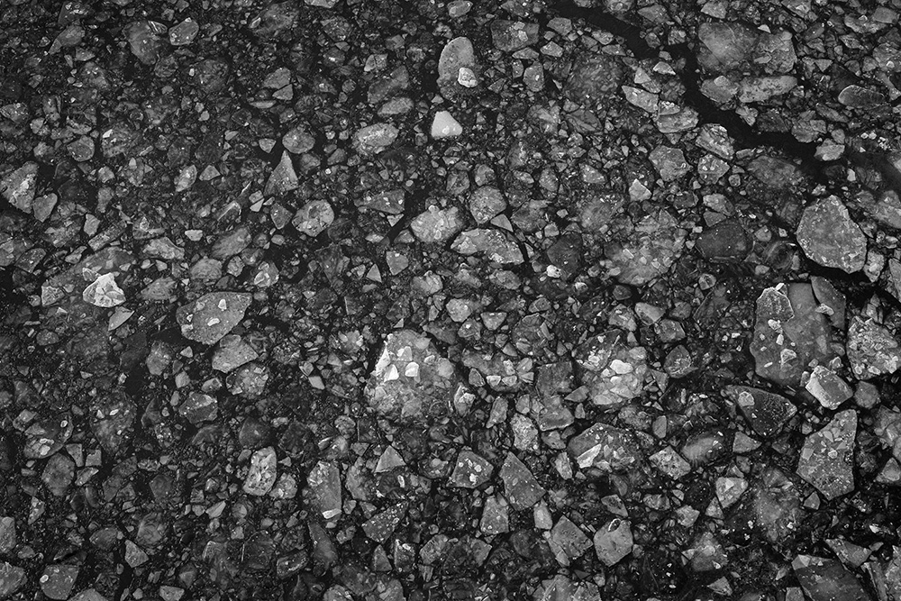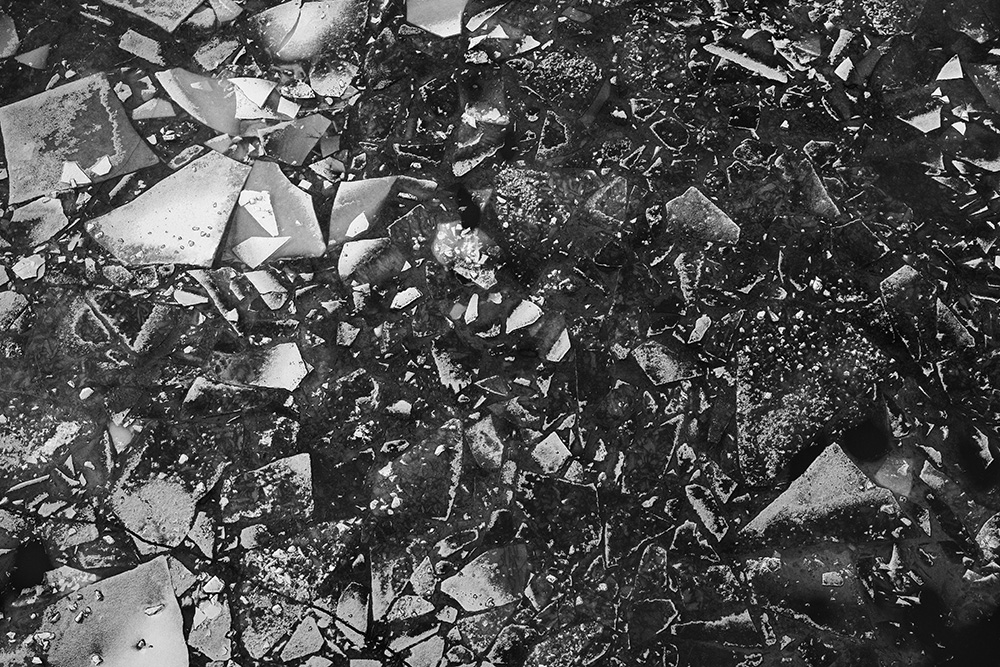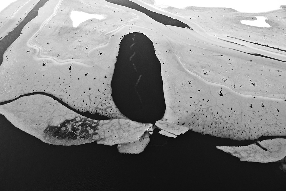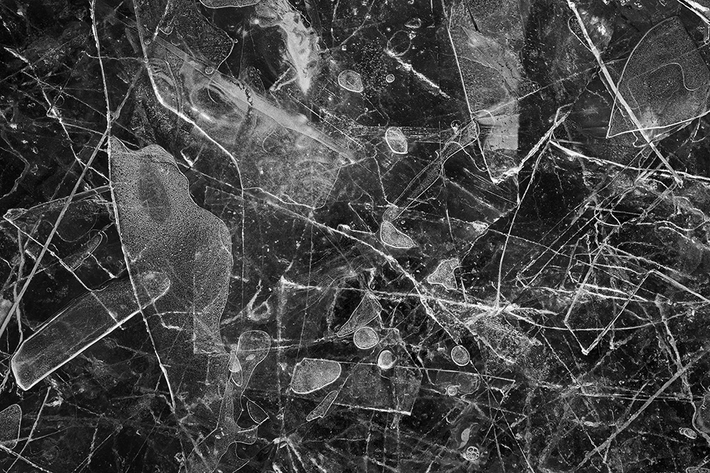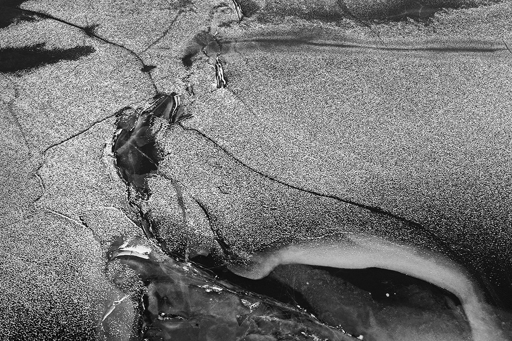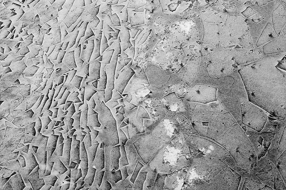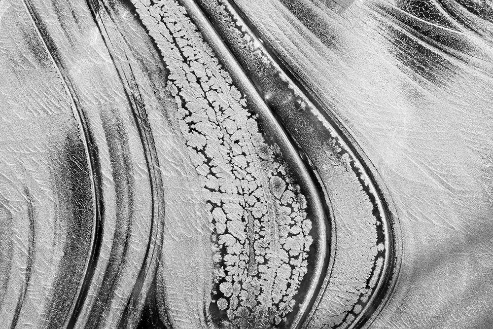 사진 속 하얗고 검은 기하학적 패턴들은 모두 얼어붙은 한강의 단면이다. 다리 위에서 수면을 부감(俯瞰)으로 촬영해, 강이 스스로 만들어낸 거대한 추상화를 프레임 안에 담았다. 눈이 쌓인 곳은 순백으로, 눈이 녹거나 거친 얼음이 드러난 곳은 짙은 검은색으로 나타난다. 늘 흐르던 강물이 유려한 선을 보여준다면, 깊은 겨울 결빙된 강물은 단단하고 정적인 면과 패턴을 드러낸다.