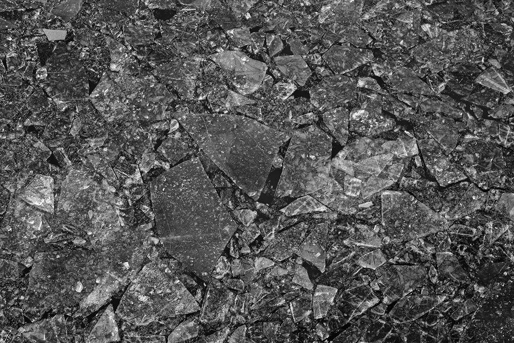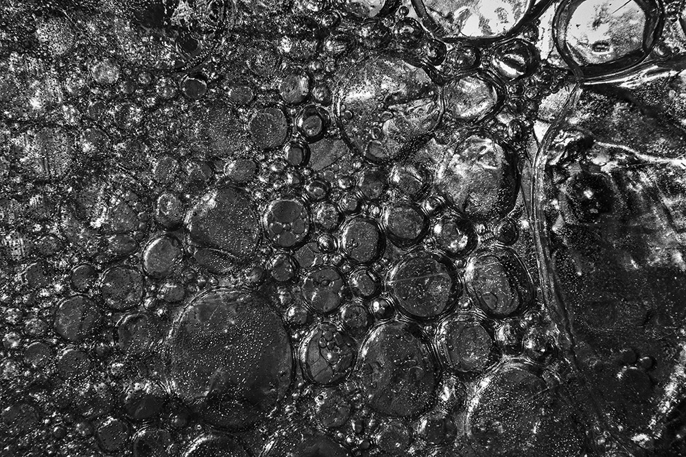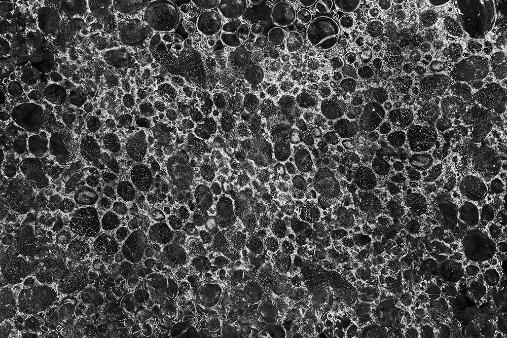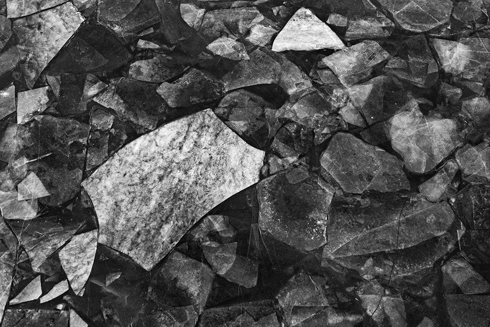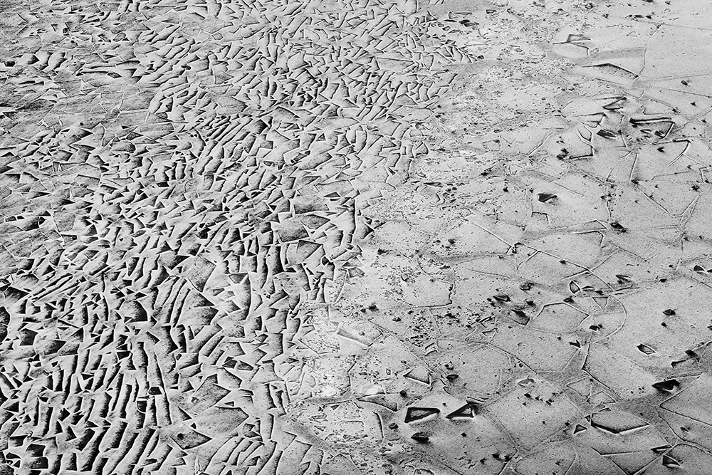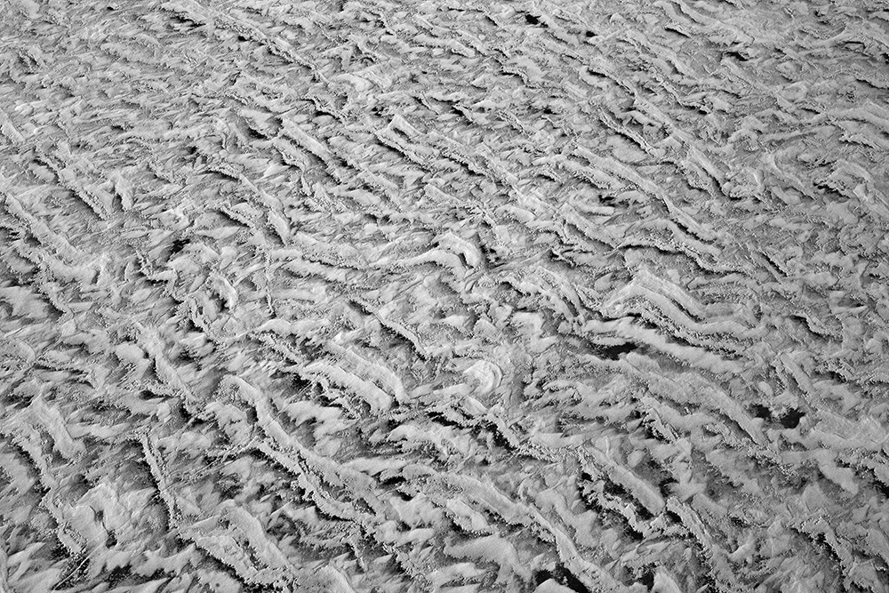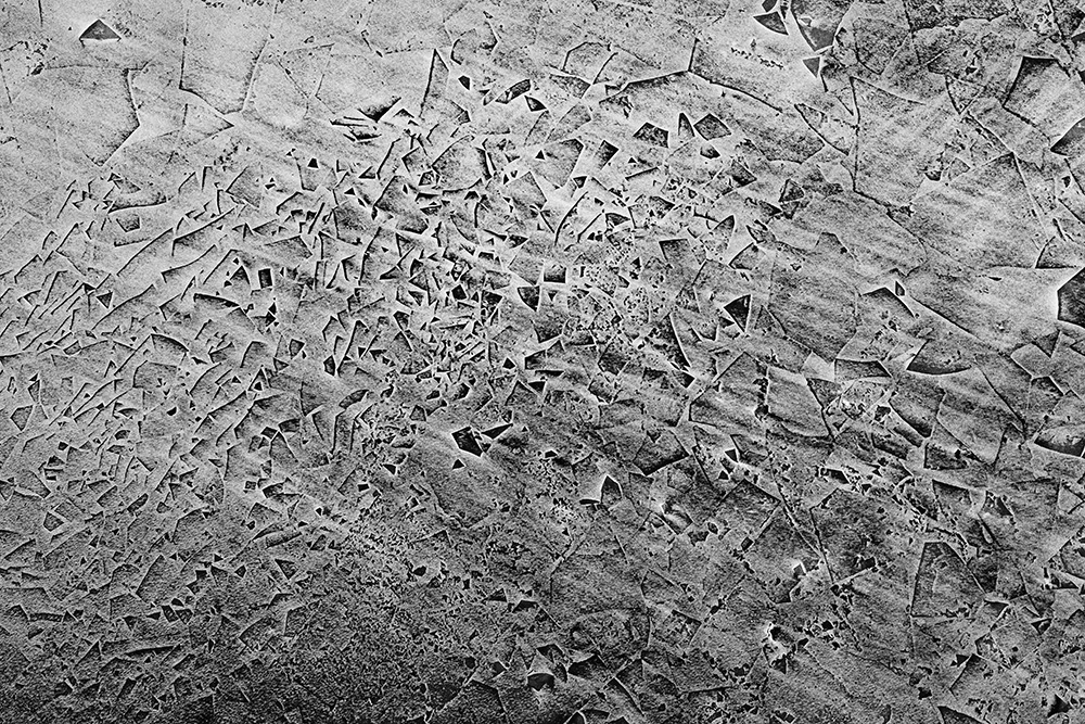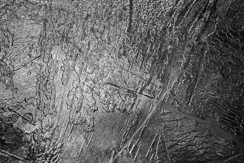 사진 속 하얗고 검은 기하학적 패턴들은 모두 얼어붙은 한강의 단면이다. 다리 위에서 수면을 부감(俯瞰)으로 촬영해, 강이 스스로 만들어낸 거대한 추상화를 프레임 안에 담았다. 눈이 쌓인 곳은 순백으로, 눈이 녹거나 거친 얼음이 드러난 곳은 짙은 검은색으로 나타난다. 늘 흐르던 강물이 유려한 선을 보여준다면, 깊은 겨울 결빙된 강물은 단단하고 정적인 면과 패턴을 드러낸다.