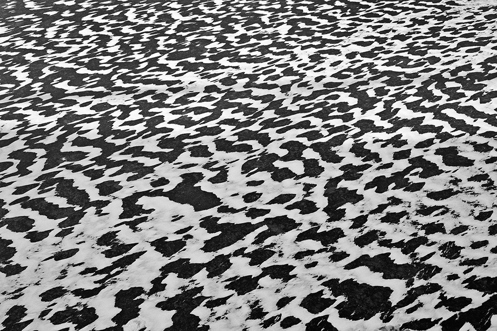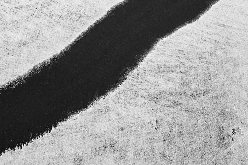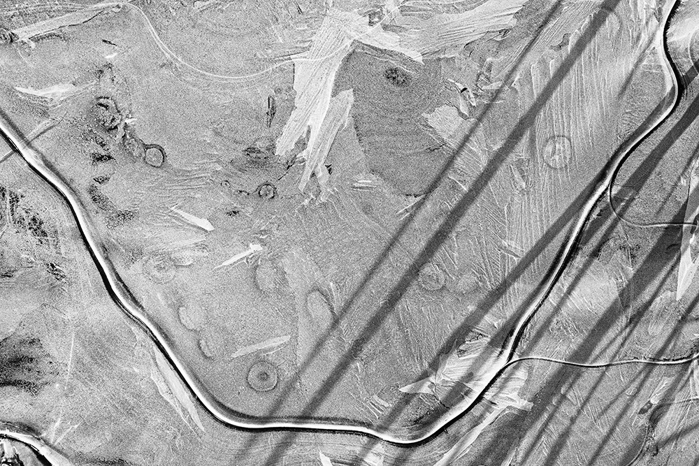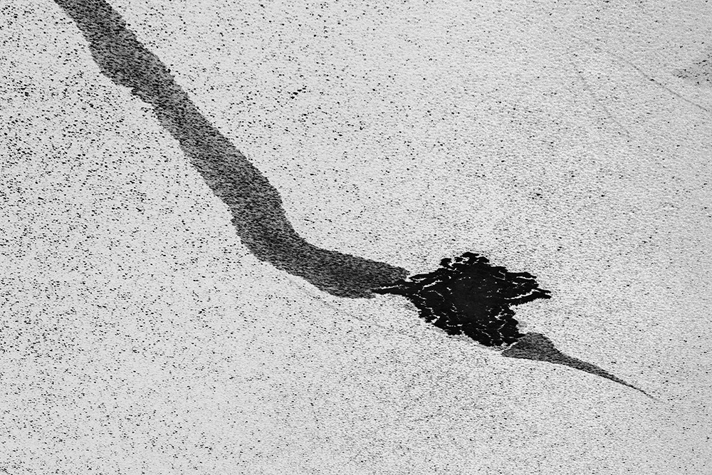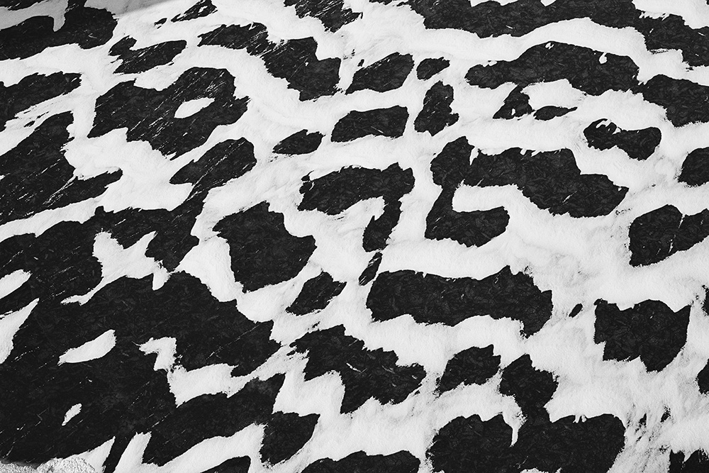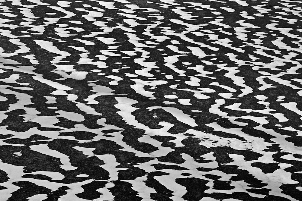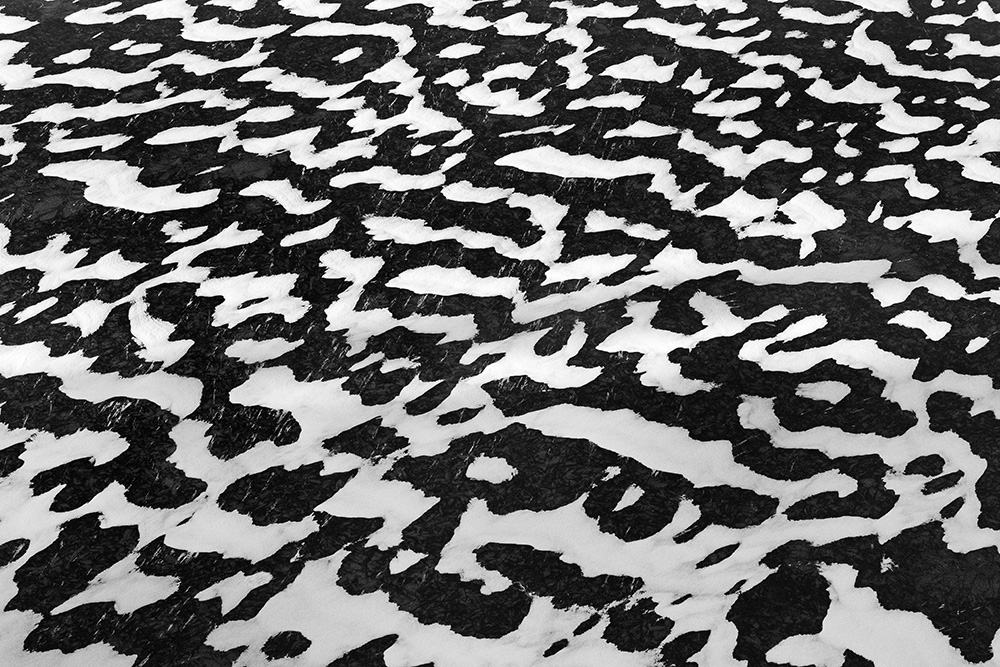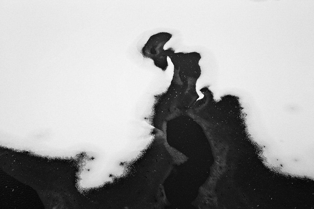 The white and black geometric patterns in these photographs are fragments of the frozen Han River. Shot from above in a bird’s-eye view, the images capture a vast abstract painting created by the river itself. Areas covered with snow appear pure white, while places where the snow has melted or rough ice remains appear deep black. If the river in its usual state reveals graceful lines through its flow, the frozen river of deep winter exposes solid and static planes and patterns.