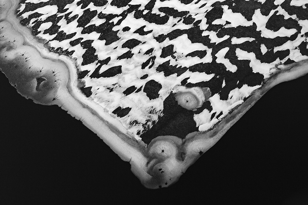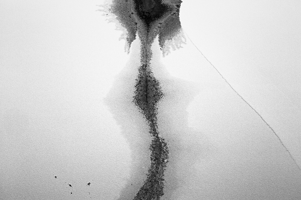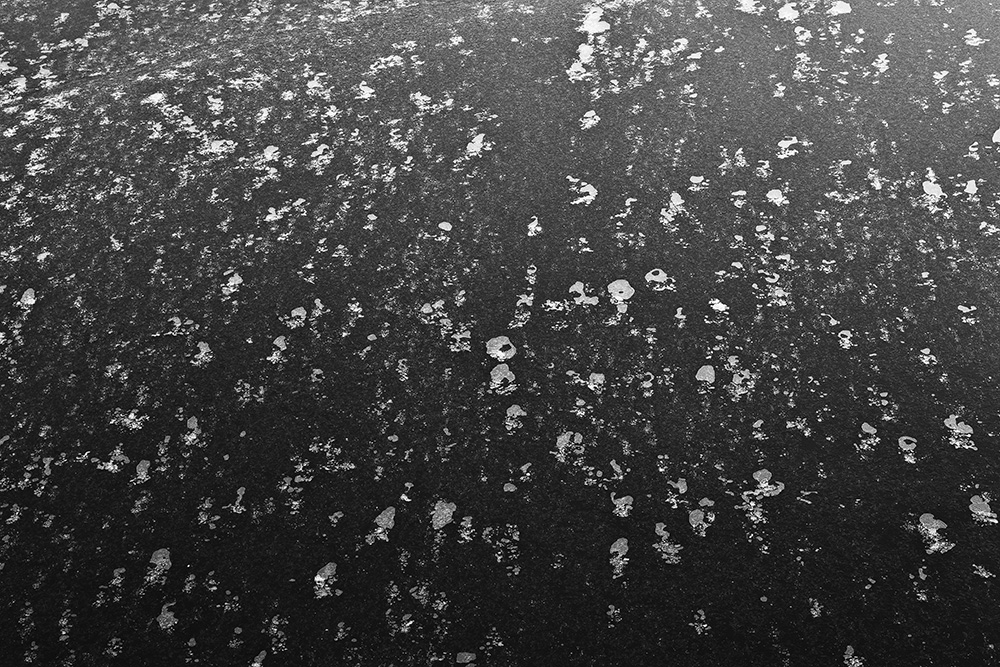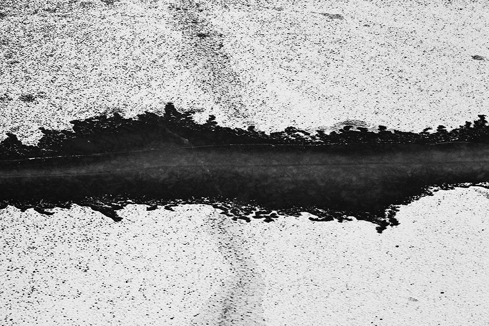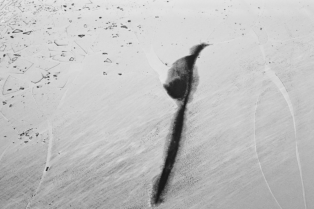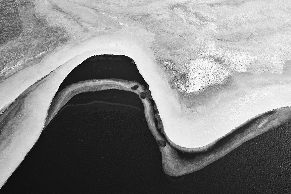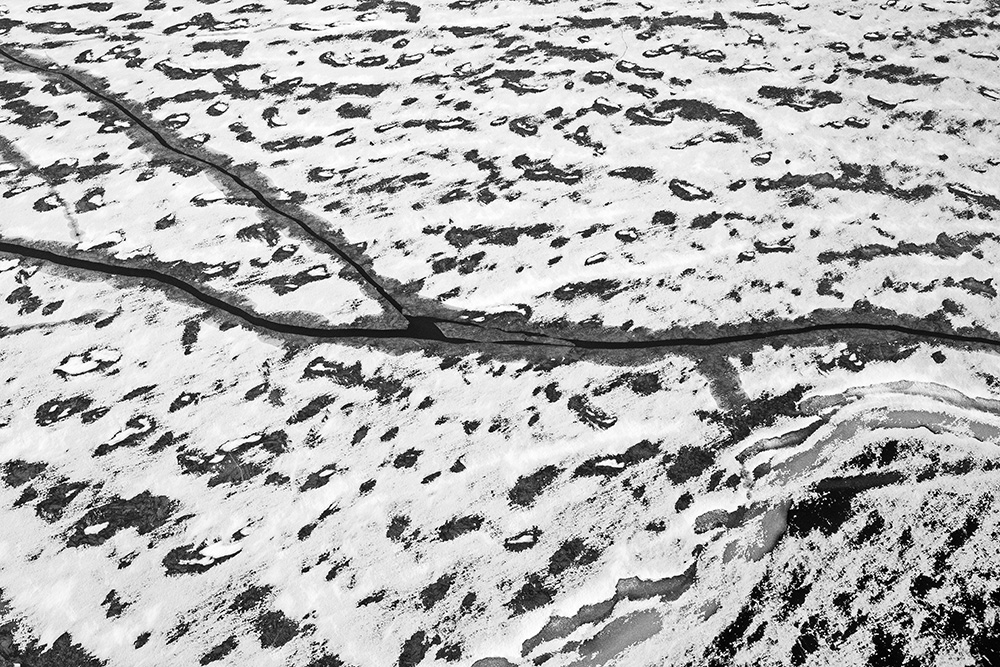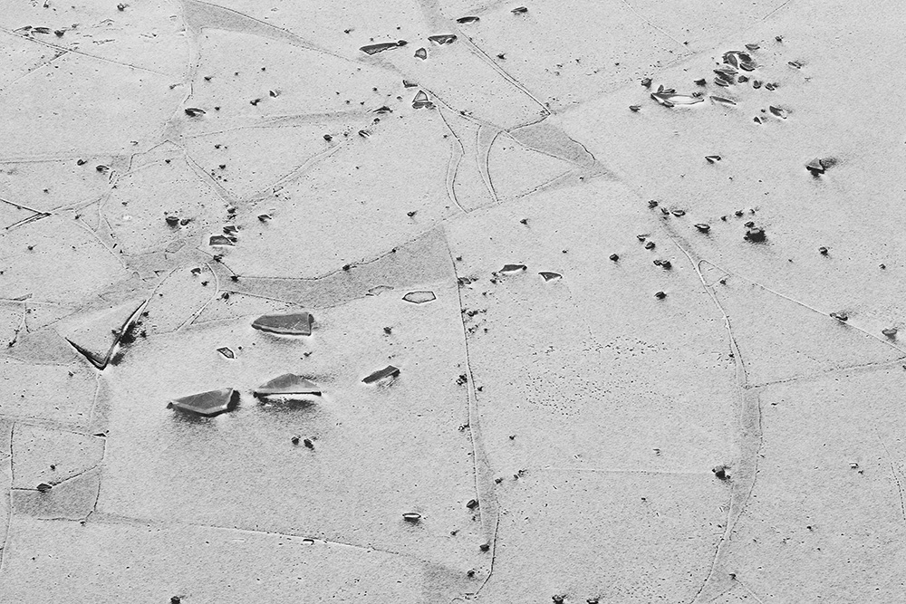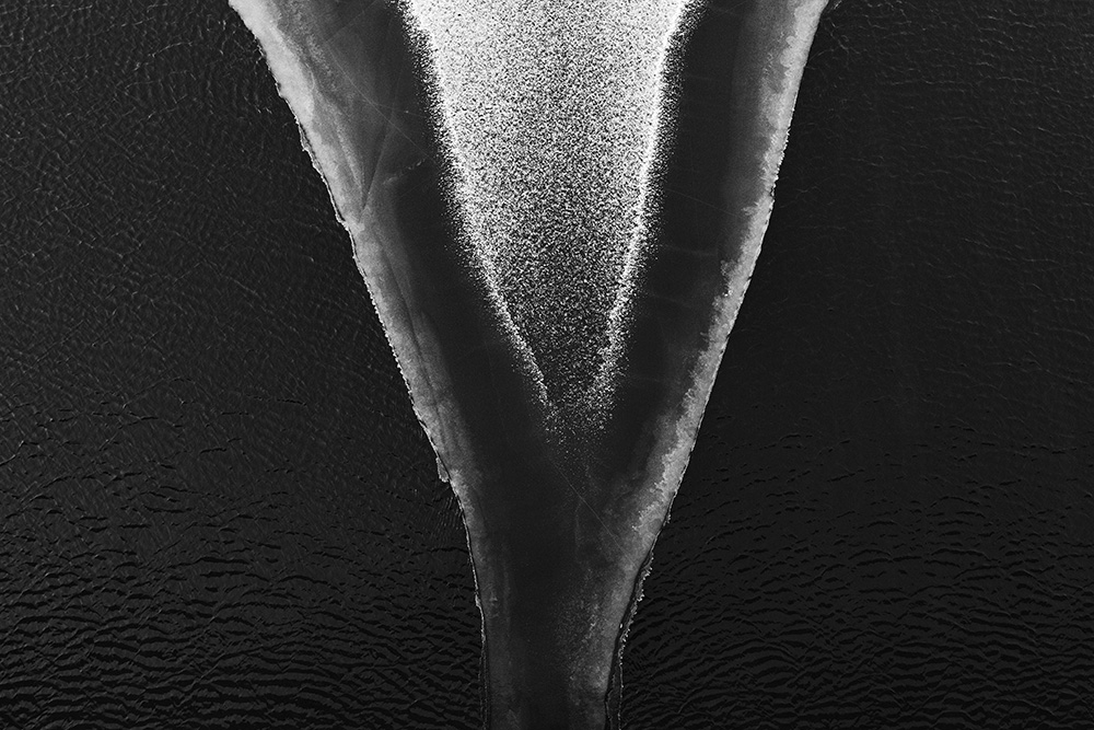 The white and black geometric patterns in these photographs are fragments of the frozen Han River. Shot from above in a bird’s-eye view, the images capture a vast abstract painting created by the river itself. Areas covered with snow appear pure white, while places where the snow has melted or rough ice remains appear deep black. If the river in its usual state reveals graceful lines through its flow, the frozen river of deep winter exposes solid and static planes and patterns.