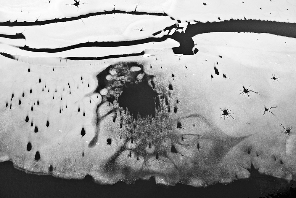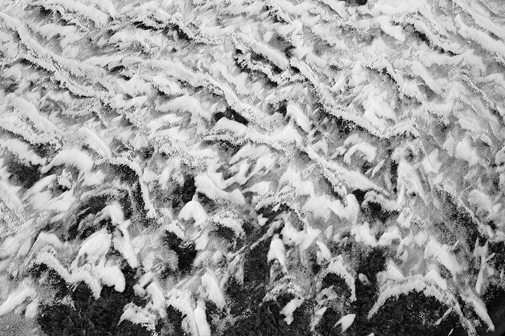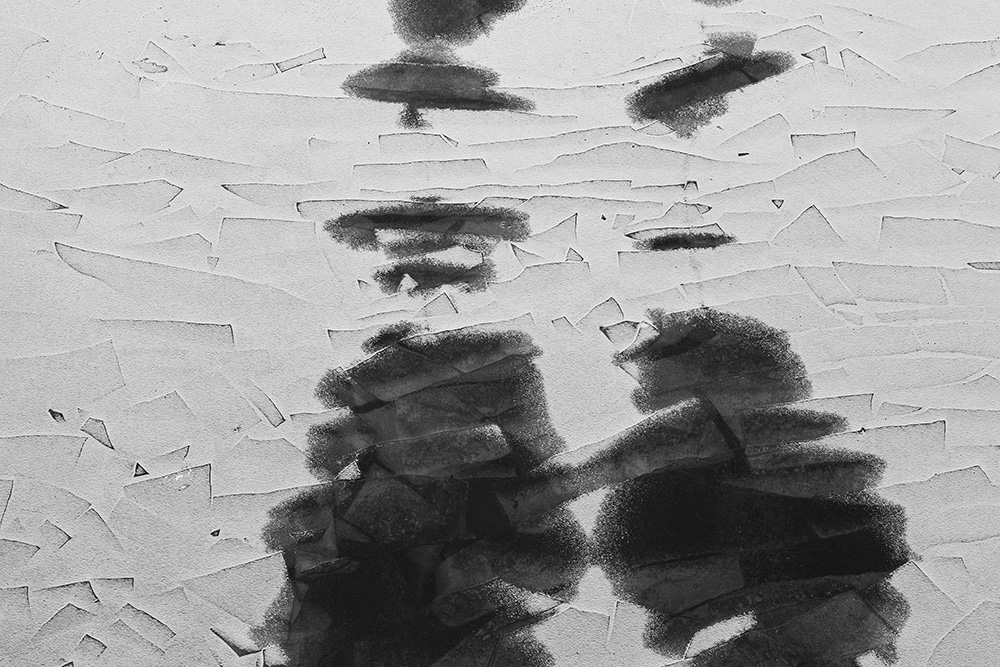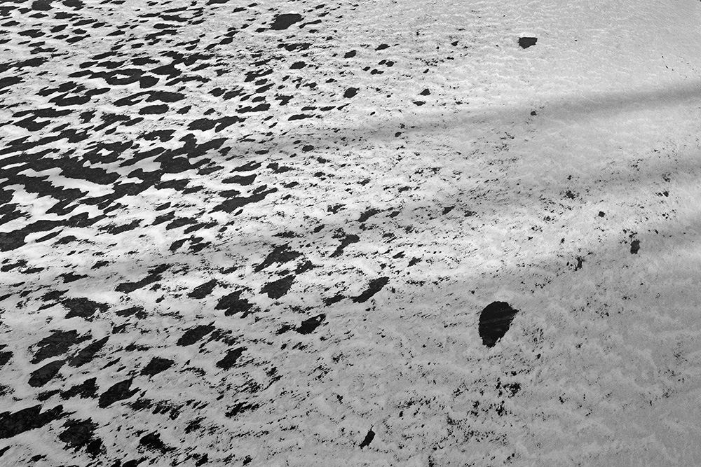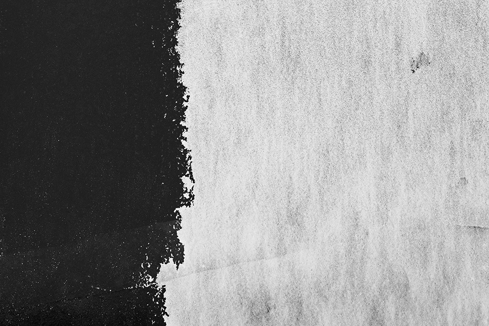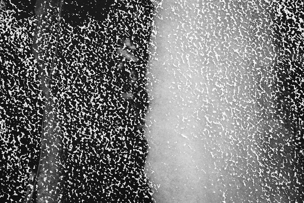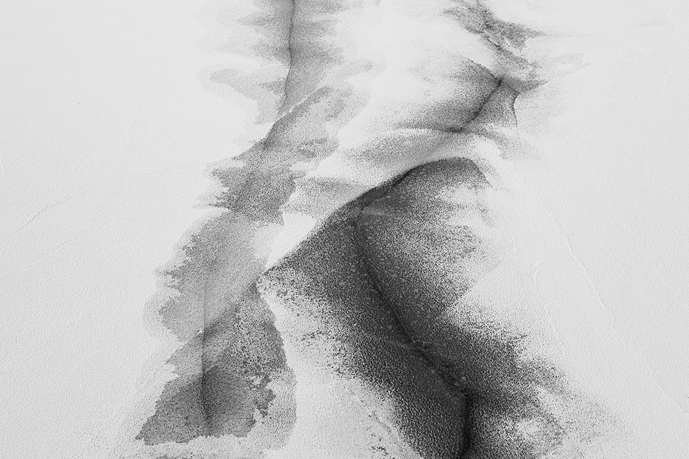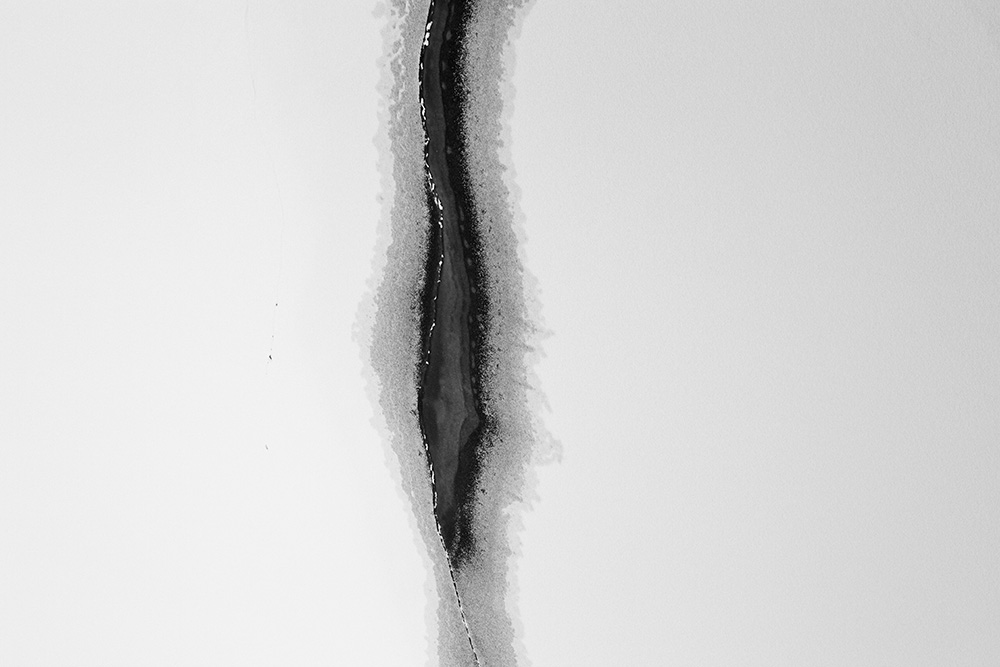 The white and black geometric patterns in these photographs are fragments of the frozen Han River. Shot from above in a bird’s-eye view, the images capture a vast abstract painting created by the river itself. Areas covered with snow appear pure white, while places where the snow has melted or rough ice remains appear deep black. If the river in its usual state reveals graceful lines through its flow, the frozen river of deep winter exposes solid and static planes and patterns.