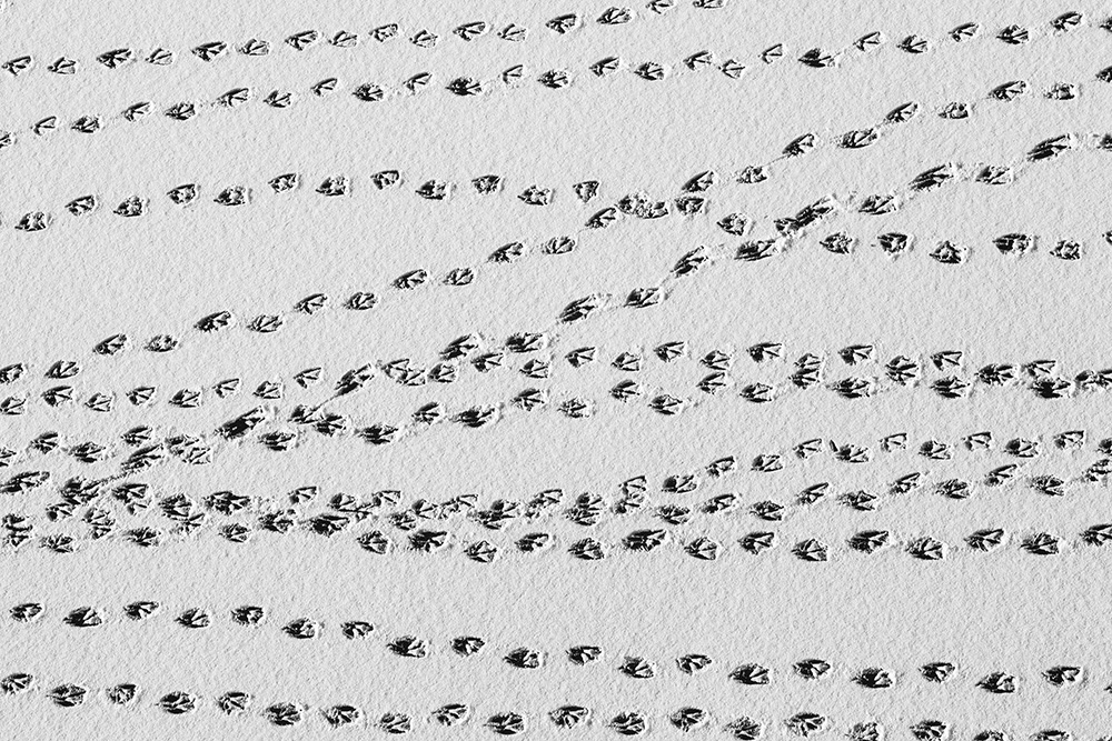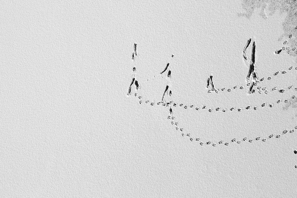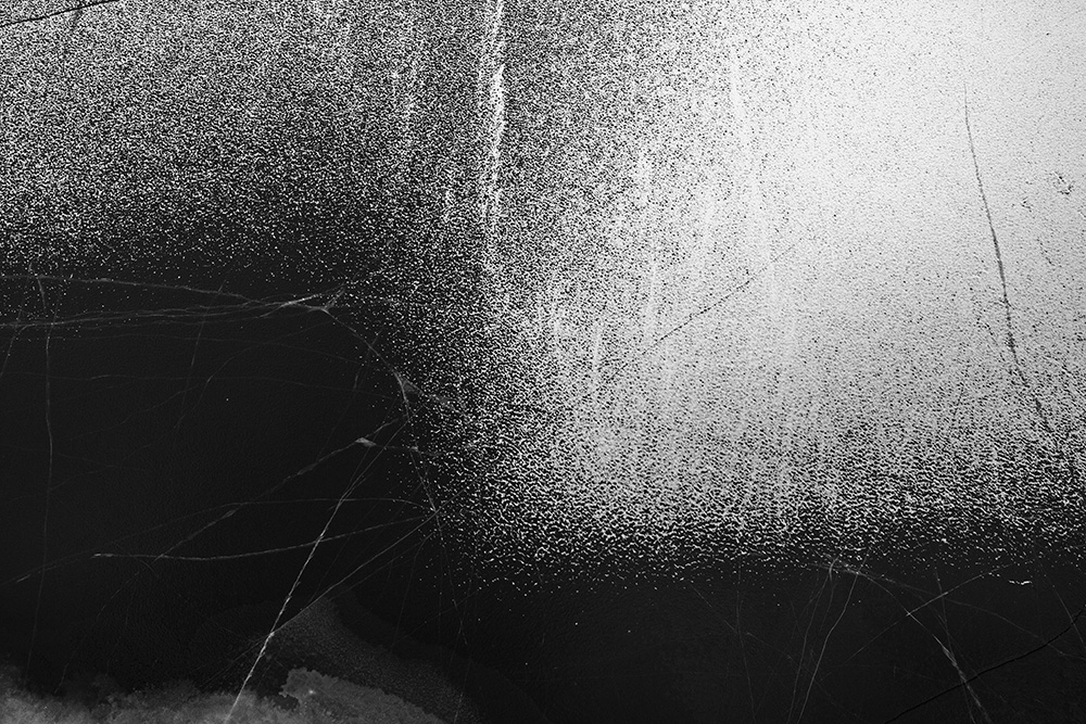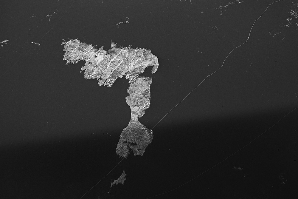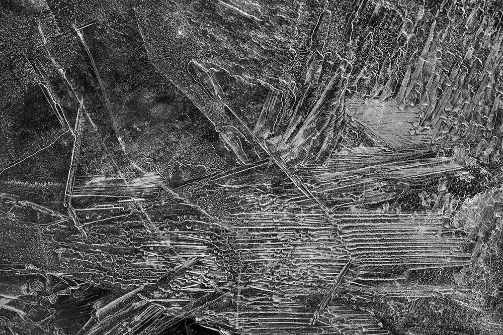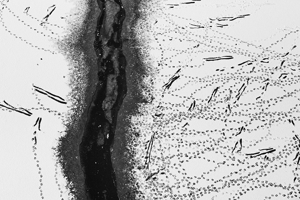 When ice forms on the surface, I stand on a bridge and look straight down at the river. The traces left by passing boats or the marks where birds briefly land appear like signals or symbols sent from the sky.