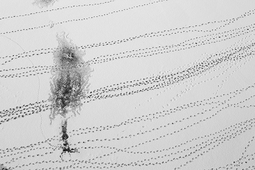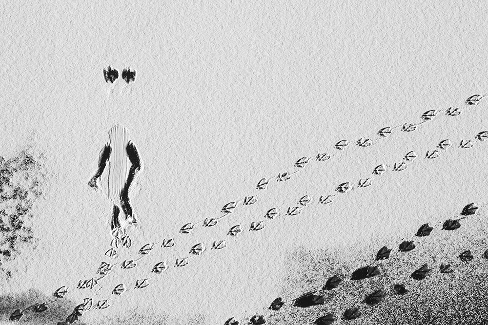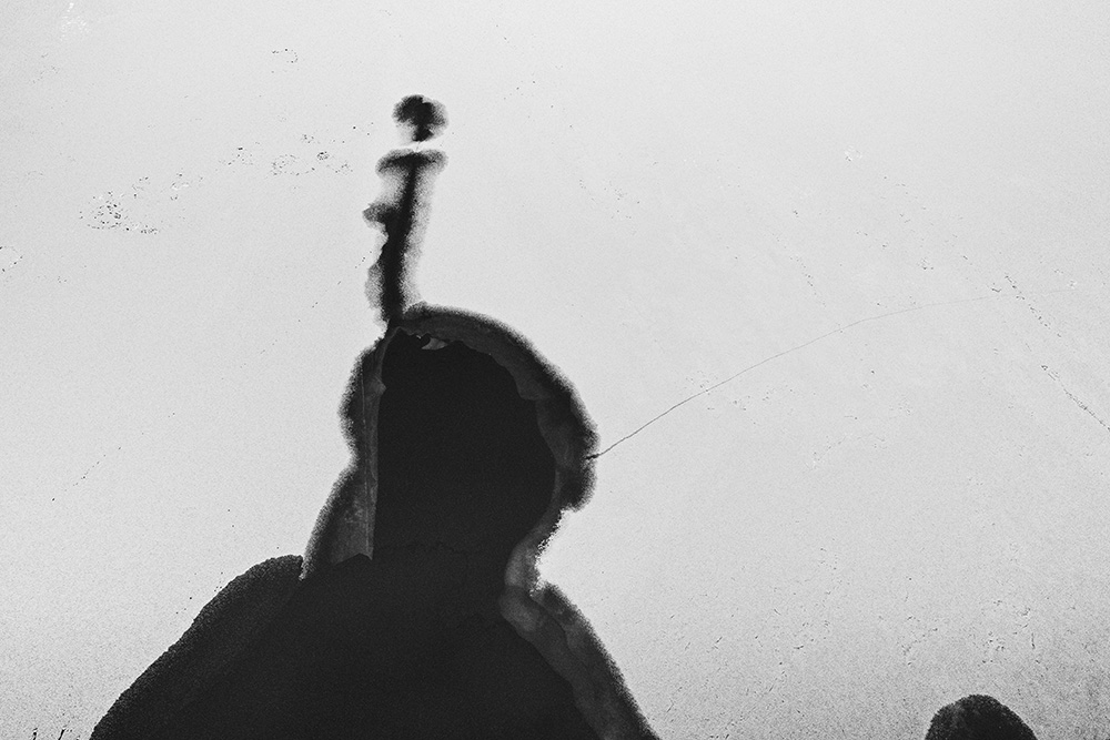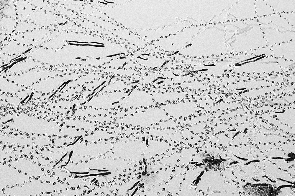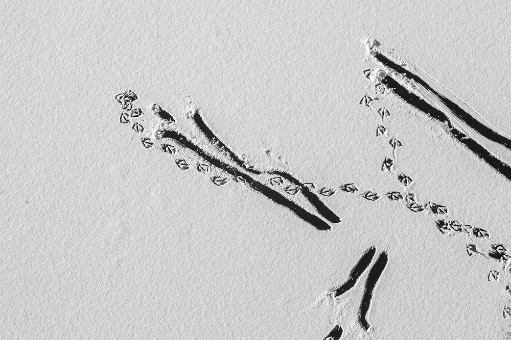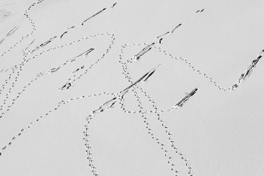 When ice forms on the surface, I stand on a bridge and look straight down at the river. The traces left by passing boats or the marks where birds briefly land appear like signals or symbols sent from the sky.