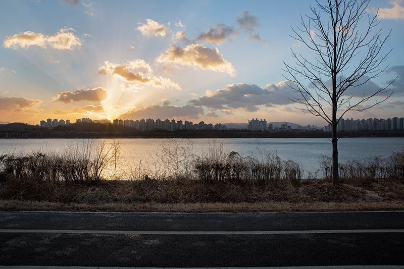 촬영 지점은 삼국시대의 주요 요충지이자 격전지였던 아차산을 등지고, 건너편 암사동 선사 유적지를 바라보는 곳이다. 1925년 을축년 대홍수로 발견된 암사동 유적은 신석기시대 한강 유역 최초의 거주지로, 수렵과 채집을 하며 빗살무늬토기를 만드는 등 인류 공동체 사회와 문화 예술의 초석을 이룬 장소다.